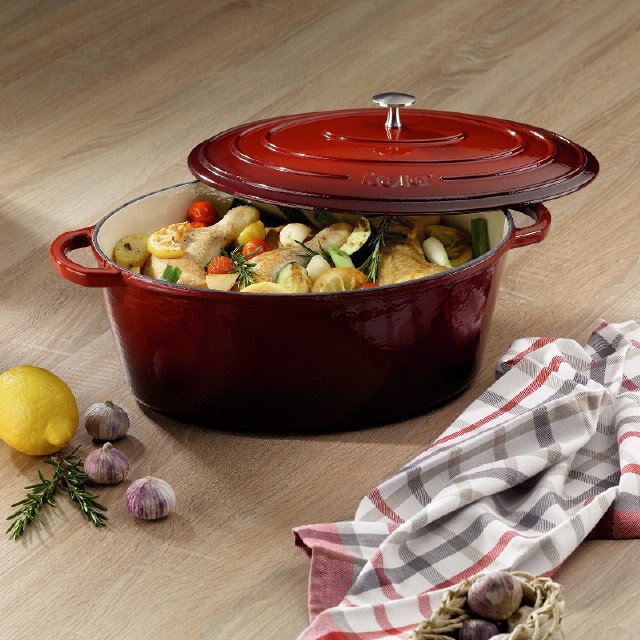 Die ovale Bratpfanne Calido hat ein stilvolles Design, das sowohl zu traditionellen Landhausküchen als auch zu modernen Haushalten passt. Mit den Geräten aus dieser Serie erfreuen Sie nicht nur das Auge, sondern auch Ihren Gaumen dank der tollen Ergebnisse beim Backen und Braten. Die Backform ist außen rot emailliert und innen beige gefärbt. Die Gusseisenpfanne leitet die Wärme nicht nur sehr gut, sondern speichert sie auch, so dass Ihre fertigen Speisen lange warm bleiben. Sie hält auch sehr hohen Temperaturen im Backofen stand. Kochgeschirr aus Gusseisen hat eine sehr lange Lebensdauer, es ist fast unsterblich. Es ist für alle Herdarten geeignet, auch für Induktion. Inklusive eines Deckels mit Edelstahlgriff. Bis zu einer Temperatur von 300 Grad Celsius einsetzbar.