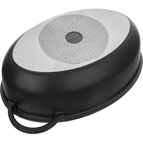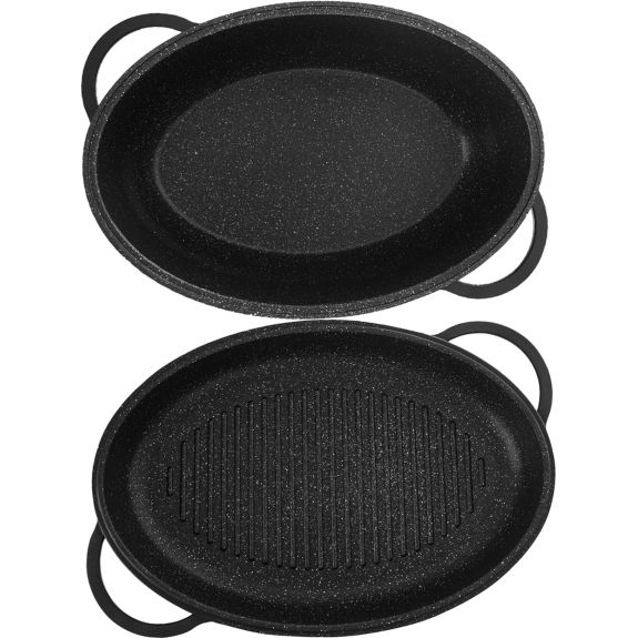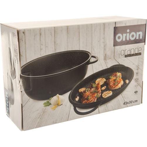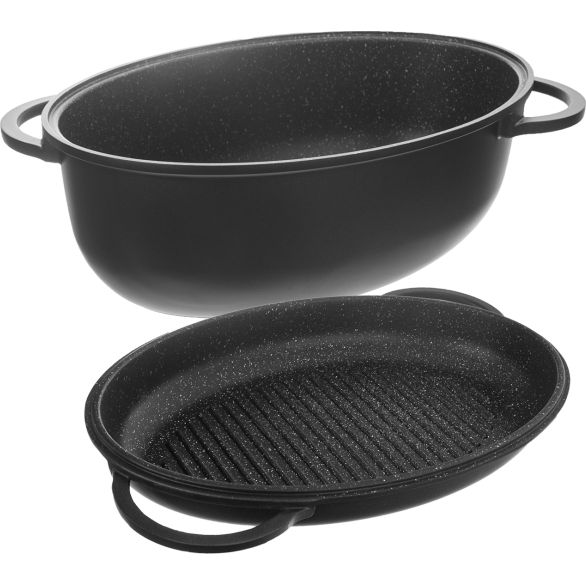 Sie können die GRANDE als klassische Bratpfanne mit Deckel für die Zubereitung von Fleisch oder jedes Teil separat verwenden - eine tiefe Bratpfanne oder eine flache Bratpfanne mit profiliertem Boden zum Braten und Frittieren. Die Bratpfannen sind innen mit einer hochwertigen Antihaftbeschichtung PFLUON GRANIT in 2 Schichten ausgestattet, die es Ihnen ermöglicht, Speisen mit einer minimalen Menge an Fett zuzubereiten. Die Außenseite besteht aus einer Schicht hochwertiger PTFE-Antihaftbeschichtung. Dank der Behandlung der äußeren Oberfläche können beide Teile auf allen Arten von Wärmequellen verwendet werden, einschließlich Induktion und im Backofen bei maximal 230 °C. Der Vorteil sind die außermittig angebrachten Griffe, mit denen die Backbleche bequem in den Backofen geschoben werden können. Material: Aluminiumlegierung mit hochwertiger Antihaftbeschichtung. Der Vorteil ist die Leichtigkeit und die einfache Handhabung. Abmessungen: Oberteil - innen 38x25x5 cm, außen 43x30x5,5 cm, Unterteil - innen 38x25x13 cm, außen 43x30x13,5 cm, Gesamthöhe 18 cm. Wir empfehlen die Verwendung von Küchenhandschuhen für die Handhabung. Kühlschranktauglich, spülmaschinengeeignet - durch aggressive Reinigungsmittel kann es zu einer leichten Oxidation des Bodens kommen - dieses Phänomen beeinträchtigt den Kochvorgang nicht, ist kein medizinischer Defekt und kann nicht reklamiert werden.