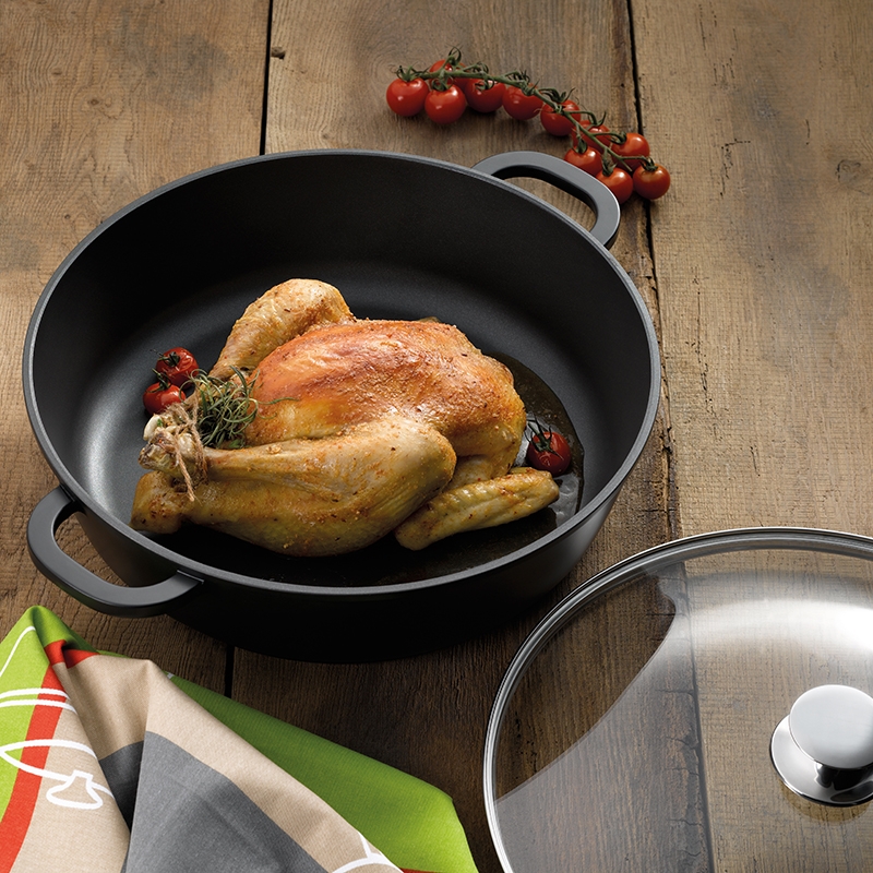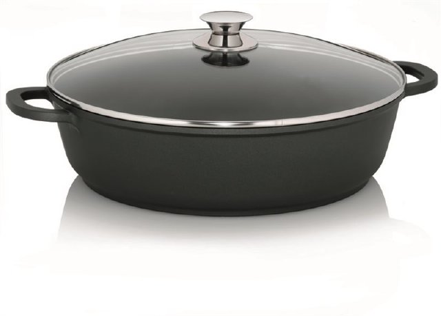 Backform mit Glasdeckel aus Aluminiumdruckguss mit einer Wandstärke von 5 mm.Die 3-lagige, keramikgefüllte Teflonschicht ist kratzfest. Verwendung: Gas, Glaskeramik, Induktion, e