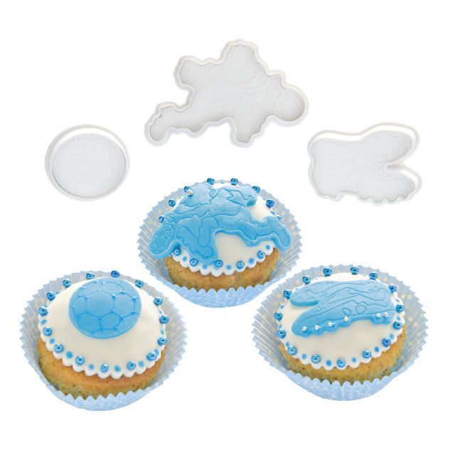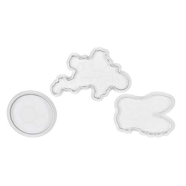 Satz 3 Stück Kunststoff-Ausstechformen aus der Form eines Balls, eines Fußballspielers und von Schuhen. Das Dekorieren von Kuchen oder Backwaren ist einfach. Die Ausstechform auf das ausgerollte Material legen, die Form ohne Stauchen des Kolbens ausschneiden – nur durch Drücken am Rand der Ausstechform. Die ausgestneiderte Form verbleibt im Inneren und wird mit dem Kolben herausgedrückt. Mit der Ausstechform können Sie den Kuchen direkt verzieren – die Ausstechform mit der ausgestochenen Form auf die Oberfläche des Kuchens legen und einfach den Kolben drücken. Ausstechformen lassen sich in der Spülmaschine reinigen. Material: Kunststoff. Abmessungen: 3,5 cm, 5 cm, 6,5 cm. Farbe: Weiß.