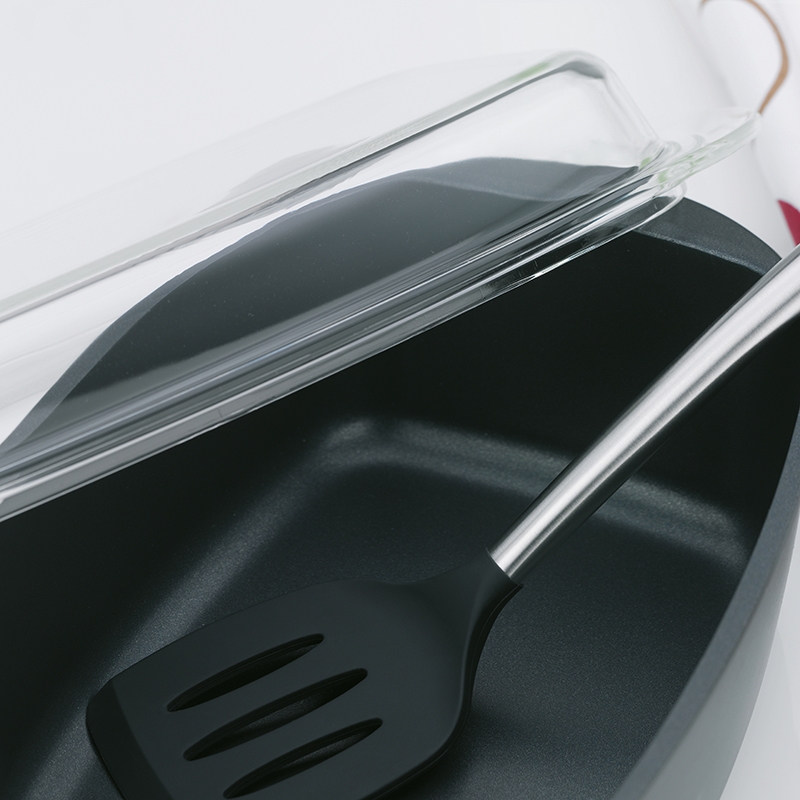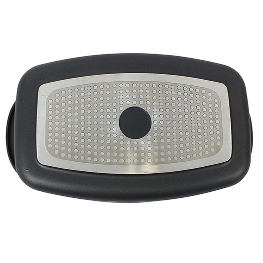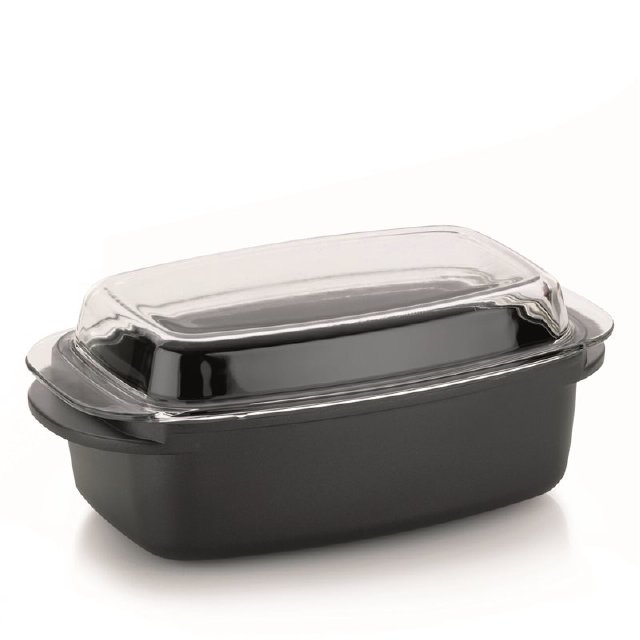 Backblech mit glasklappigem Deckel aus druckgegossenem Aluminium, Wandstärke 5 mm. Der Backblech verfügt über eine hochwertige, antihaftbeschichtete GREBLON - C3 Oberfläche. Die 3-schichtige, keramisch gefüllte Teflon-Schicht ist kratzfest. Verwendung: Gas, Ceran, Induktion, Elektro