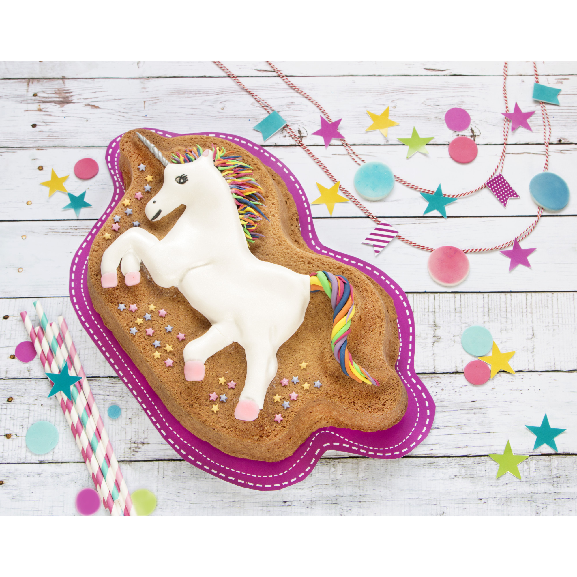Backform in Form eines Einhorns nicht nur für Kinderkuchen zu Geburtstagen und anderen Anlässen. Volumen 2,5 l, Maße 36 x 21 cm.