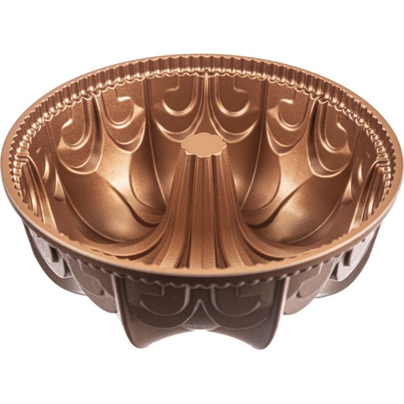 Die untypische Designerform der Gugelhupfform MARISSA ORIENT in einem sehr trendigen, luxuriös wirkenden Design und in der Farbe Kupfer. Die Form ist nicht nur praktisch, sondern auch beeindruckend. Darüber hinaus ist sie eine schöne Dekoration in modernen und rustikalen Küchen.