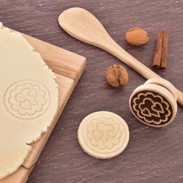 Stempel für die Herstellung von selbstgebackenen Keksen. Sehr schnell und einfach erstellen Sie ein Ornament auf einem ausgeschnittenen Kreis aus Teig. Nach dem Backen sehen sie toll aus und werden nicht nur Kinder begeistern. Material: Buchenholz. Maße: B. 5,5 cm. H. 3,3 cm. Nicht spülmaschinenfest. Zum Ausstechen können Sie das Rad 127452 verwenden.