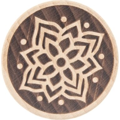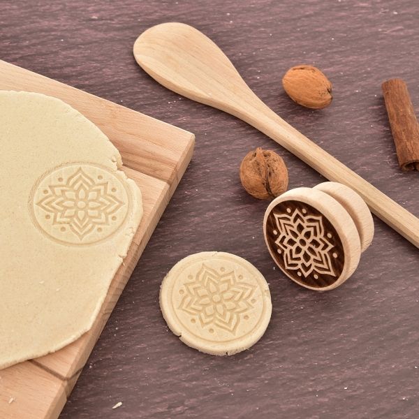 Stempel für die Herstellung von selbstgebackenen Keksen. Sehr schnell und einfach erstellen Sie ein Ornament auf einem ausgeschnittenen Kreis aus Teig. Nach dem Backen sehen sie toll aus und werden nicht nur Kinder begeistern. Material: Buchenholz. Maße: B. 5,5 cm. H. 3,3 cm. Nicht spülmaschinenfest. Zum Ausstechen können Sie das Rad 127452 verwenden.
