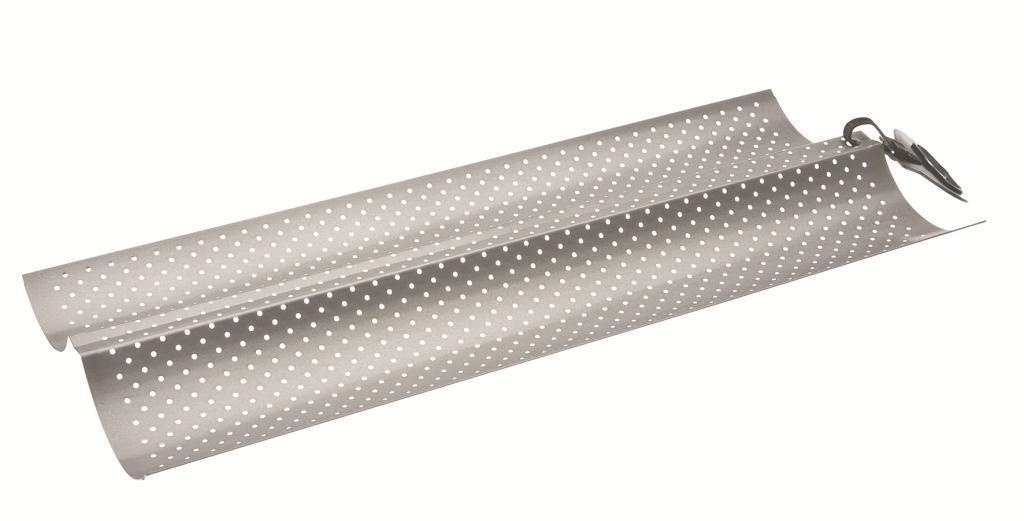 Spezielle Baguetteform mit den Maßen 38 x 16,5 cm zum Backen von zwei Baguettes. Der Metallboden ist antihaftbeschichtet und perforiert, um eine goldene und knusprige Kruste zu erhalten. Die Baguetteform kann in einem heißen Gas- oder Elektroofen verwendet werden und hält Temperaturen bis zu 230° Celsius stand. Wir empfehlen die Reinigung mit der Hand und nicht in der Spülmaschine. Höhe 2,5cm. Wir empfehlen eine Form für 4 Baguettes!