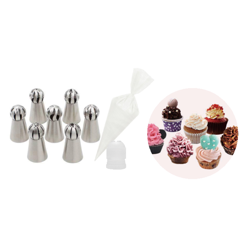 Die Sets enthalten Zierspitzen für Cupcakes, eine Dekorationsspritze und eine Schnur. Im Packung 1
