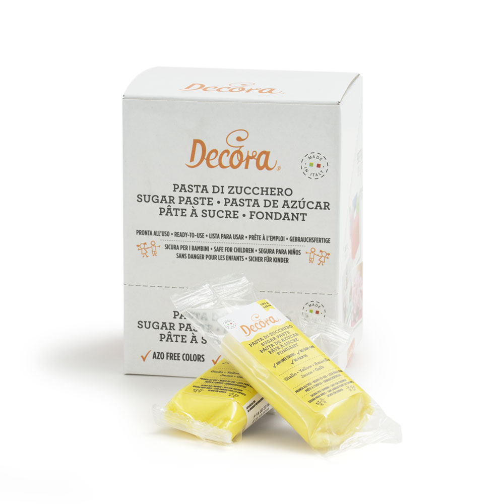 Gelbe Modellierzuckerpaste in Vakuumbeuteln verpackt. Die Zuckerpaste hat dank der Kakaobutter eine perfekte Formbarkeit und Elastizität, sie ist ideal zum Überziehen von Torten, zum Herstellen von Blumen und 3D-Objekten, man kann sie von Hand oder mit Teig bis zu 1 mm dick bemalen, angenehm im Geschmack dank des leichten Mandelduftes. Die gefärbte Zuckerpaste bietet mehrere Dekorationsmöglichkeiten mit beträchtlichen Einsparungen, so dass sie auch die ideale Paste für die Herstellung von Objekten und Dekorationen wie Blumen und Blättern ist, so dass die Objekte und Dekorationen perfekt bleiben, ohne dass die Gefahr besteht, dass sie zusammenfallen oder brechen.frei von Azofarbstoffen, Palmöl und GVO. Packung 100 gr.
