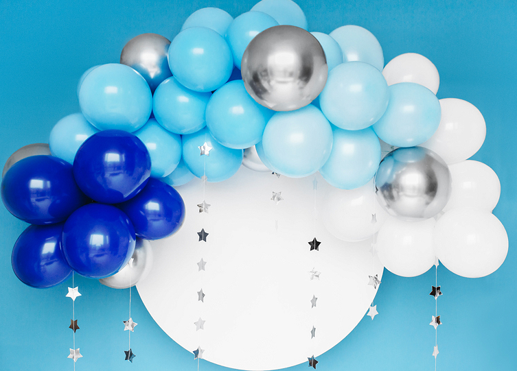 Ballonggirlande, die etwa 200 cm lang ist. Das Set enthält: Ballons in Blau, Silber und Dunkelblau, außerdem ca. 2,5 m Band für Ballongirlanden.