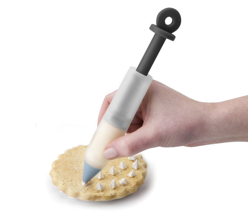 Mit diesem Stift können Sie selbst komplexe Lebkuchendekorationen leicht bewältigen. Der Dekorationsstift ist solide, so dass er sich im Gegensatz zu Beuteln nicht wölbt, und Sie haben dank des Kolbens immer die Kontrolle über die Menge an Zuckerguss oder Creme, die Sie herausdrücken. Länge des Stifts: 12 cm.