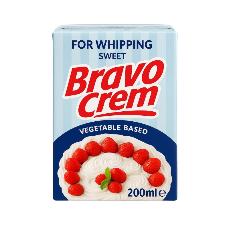 Pflanzlicher Schlagcreme Bravo Cream 200 ml bietet eine stabile und luftige Alternative zur klassischen Sahne für Desserts, Kuchen und milchfreie Füllungen.