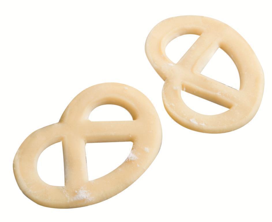 Verzinnte Brezelform mit den Maßen 6,5x4,5cm und Kolben-Teigextruder.