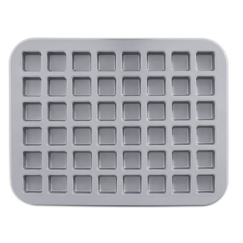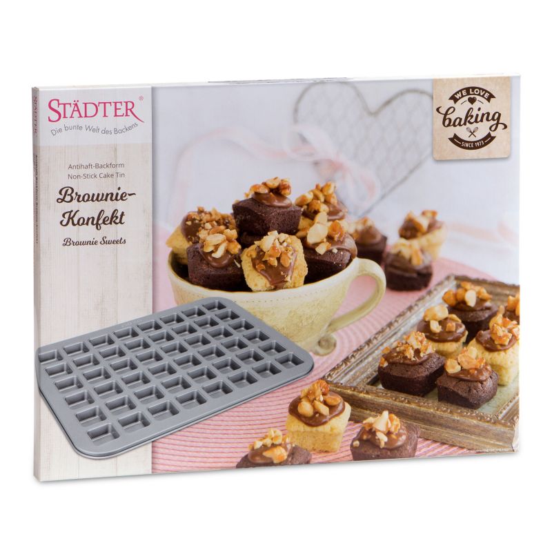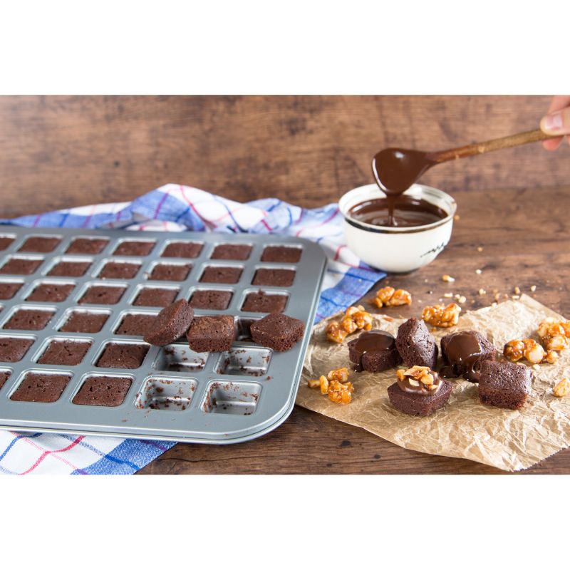Backform für die Herstellung von Mini-Brownies. Diese Backform kann auch für andere Arten von Kuchen verwendet werden und eignet sich auch sehr gut für die Herstellung von Schokolade. Die Form ist aus rostfreiem Stahl und kann für 1x 48 Mini-Brownies mit den Maßen 3,5x3,5x1,5cm verwendet werden.