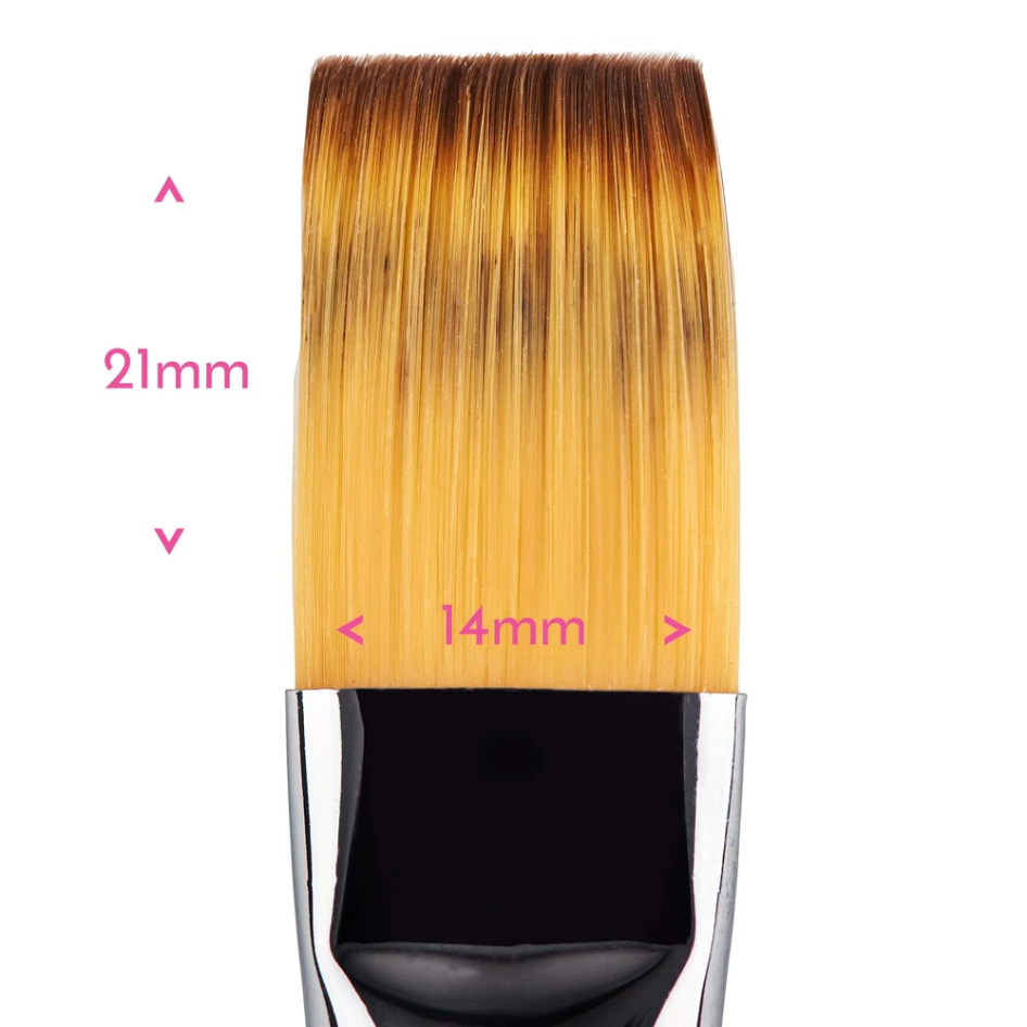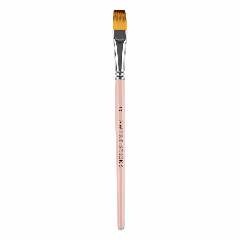 Flache Pinsel haben ein quadratisches Ende mit mittleren bis langen Borsten. Sie eignen sich hervorragend für breite Pinselstriche, bei denen Sie eine große Farbabdeckung wünschen. Wenn Sie auf einer Fläche arbeiten, für die ein herkömmlicher Pinsel zu groß sein könnte, bietet ein flacher Pinsel eine hervorragende Abdeckung und gleichzeitig etwas mehr Kontrolle. Flache Pinsel können auch für dicke bis dünne Linien verwendet werden, aber für viele Leute ist ein abgeschrägter Pinsel besser geeignet, um etwas mehr Komfort und Kontrolle zu haben, wenn sie auf einer aufrechten Torte arbeiten.