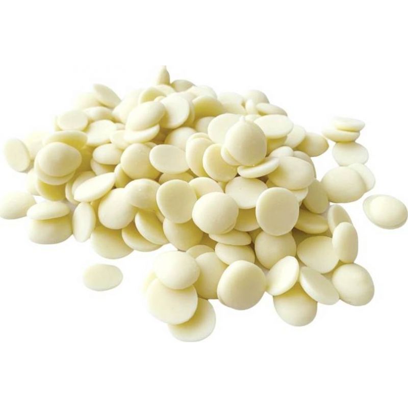 Weiße Schokolade in Kernen schmilzt leicht, hat einen wunderbaren Geschmack und ein wunderbares Aroma. Sie kann zur Herstellung von Zuckergüssen, Teigen und Cremes usw. verwendet werden. Zutaten: Kakaomasse, Zucker, Kakaobutter, Emulgator E322 (Soja). Gehalt an Kakaotrockenmasse min. 60%. Nährwertangaben pro 100 g: Energie 2269 kJ/545 kcal, Fett 36 g (davon gesättigt 22 g), Kohlenhydrate 45 g (davon Zucker 40 g), Ballaststoffe 8,1 g, Eiweiß 6,3 g, Salz 0,01 g