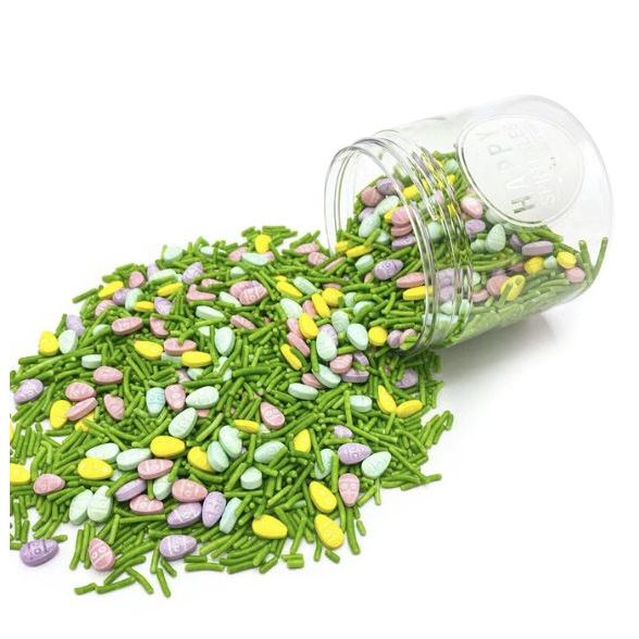 Mit dieser Streumischung macht die Suche nach Ostereiern richtig Spaß. Bunte Ostereier in Gelb, Rosa, Türkis und Lila, eingebettet in süßes grünes Ostergras, verwandeln jedes Gebäck im Handumdrehen in eine spektakuläre Osterwiese. Egal ob Sie einen Kuchen, Muffins, Donuts oder einen Hefezopf backen. Mit dieser Streuselmischung bekommen sie immer den nötigen österlichen Touch.