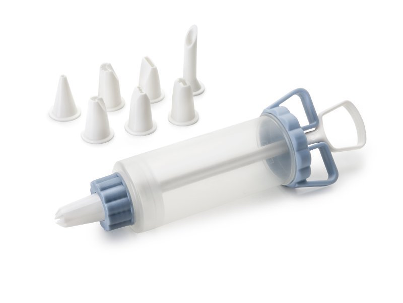 Die Dekorierpistole besteht aus Kunststoff und ist mit einem Stößel ausgestattet, mit dem Sie Sahne oder Zuckerguss jedes Mal leicht und präzise herausdrücken können. Die einzelnen Garnierspitzen lassen sich auf die Pistole schrauben, sodass man sie während des Dekorierens wechseln kann.