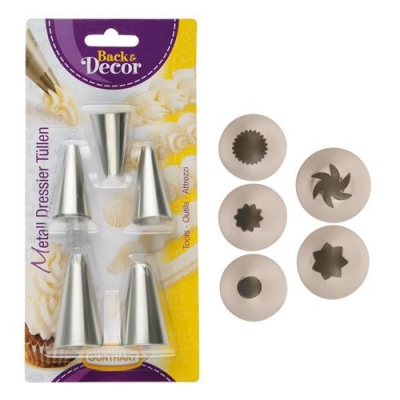 Die Dekospitze lässt sich einfach auf den Dekorationsbeutel aufstecken, den Sie ebenfalls bei uns erwerben können. 9 Edelstahl-Dekorspitzen in der Packung. Jede hat eine andere Spitze. So können Sie aus Cremes Wellen, Blumen oder andere interessante Formen kreieren. Die Spitzen sind abwaschbar, sie können in der Spülmaschine gereinigt werden.