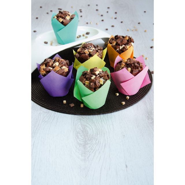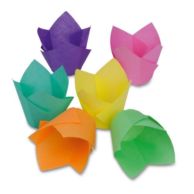 "Tulpenförmige Papierbackförmchen in verschiedenen Farben. Die Papierförmchen eignen sich zum Backen von Muffins und Cupcakes.