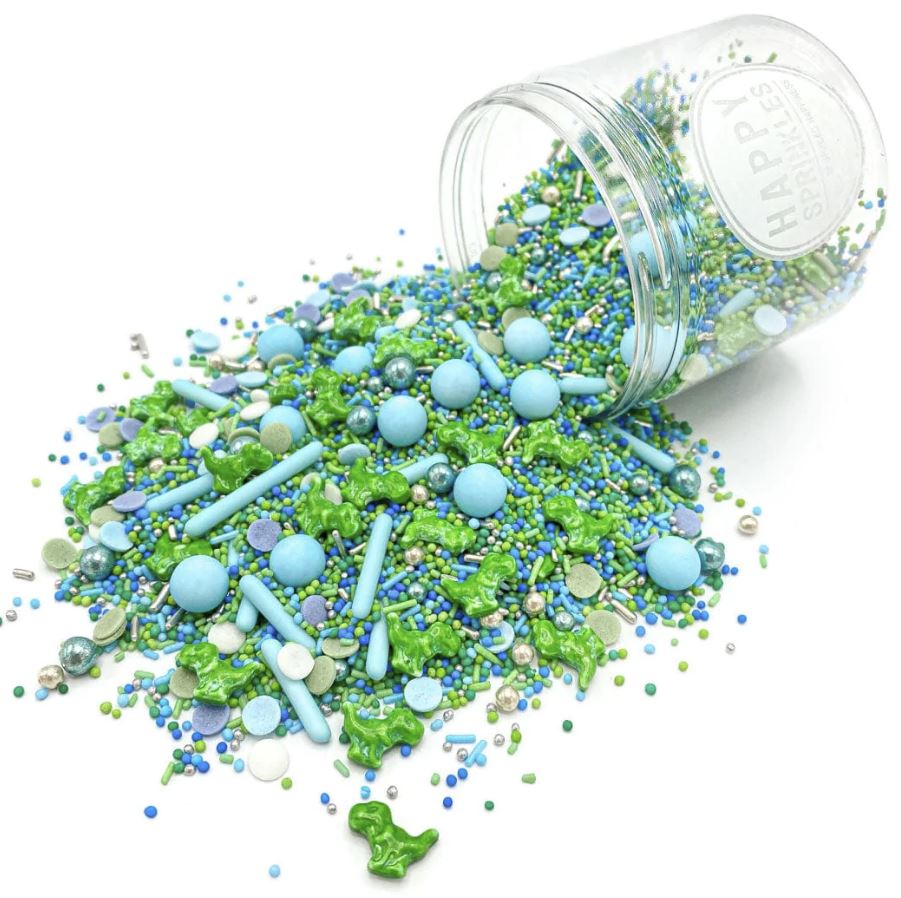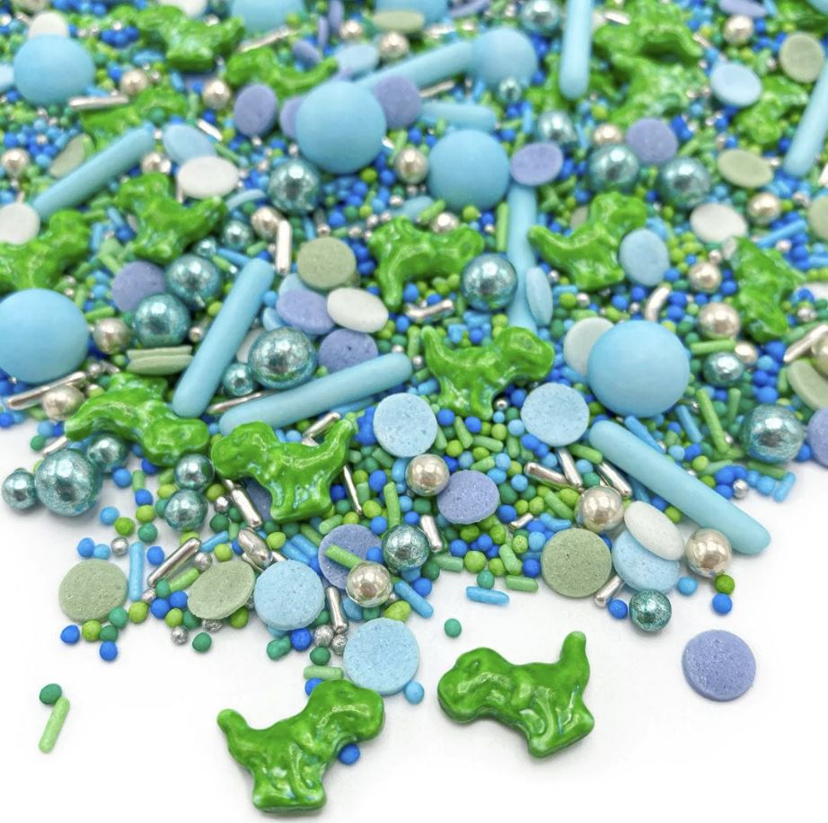 Wer hat sich als Kind nicht seine eigenen Dinosaurier gewünscht. Mit dieser Streugutmischung können Sie sie wieder zum Leben erwecken. Neben den kleinen T-Rex-Dinosauriern finden Sie blaue, grüne und silberne Schokoladenperlen, blaue Sticks und blau-grünes Konfetti. Die Basis besteht aus grünen und blauen Zuckerperlen und silbernen Strängen. Wenn Sie die Blicke auf sich ziehen wollen, sind die Jurassic Party Sprinkles genau das Richtige für Sie. Mit ihrem ungewöhnlichen Motiv sind die Streusel ein echter Hingucker.
