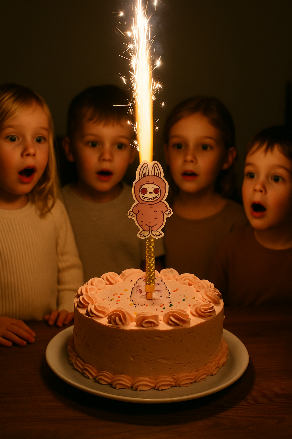 Originelle Figur Labubu, die aus der Torte herauslugt, bringt kleine und große Jubelpöpelinnen zum La