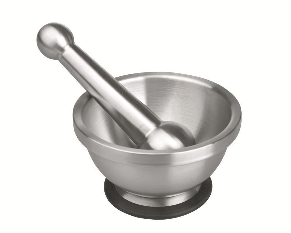 Die Basis des Dübels ist ein spezieller rostfreier Stahl, aus dem beide Elemente des Produkts gefertigt sind. Außerdem ist die Unterseite des Mörsers mit Kunststoff überzogen, was für eine hohe Stabilität bei der Verarbeitung jeglicher Köstlichkeiten sorgt. Ein hochwertiges Küchenzubehör, das Ihnen eine einfache Handhabung bietet. Abmessungen: 13,5 x 7,5 cm