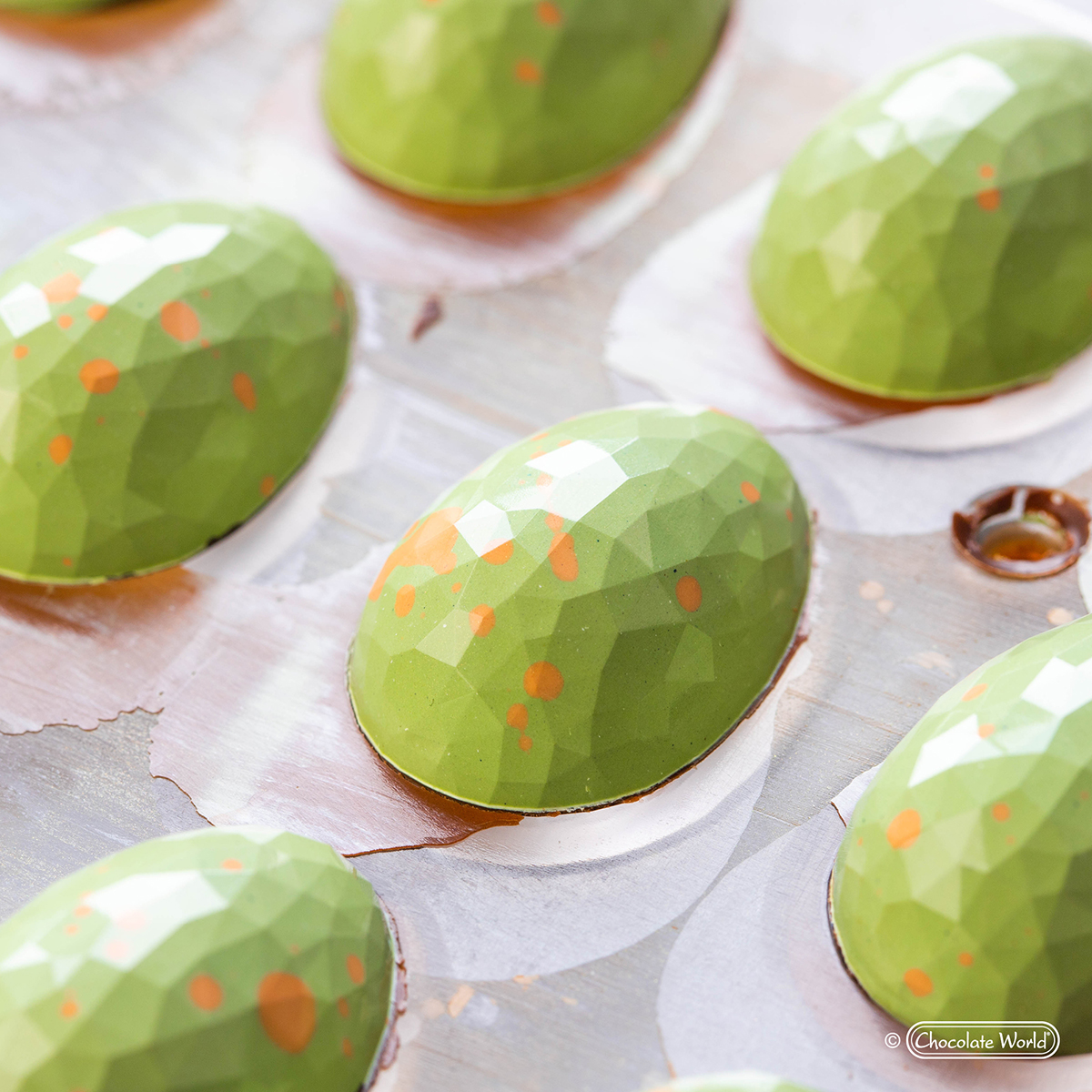 Polycarbonatform für die Herstellung perfekter Schokoladentrüffel. Diese hochwertige europäische Form ist einfach zu verwenden, Ihre Schokolade hat eine glänzende Oberfläche und hebt sich leicht ab. Um bunte Schokoladenstücke zu erhalten, bestreichen Sie die Form mit einer dünnen Schicht gefärbter Kakaobutter, bevor Sie die Form mit Schokolade füllen. Das Design dieser Form stammt von Andrey Dubovik.