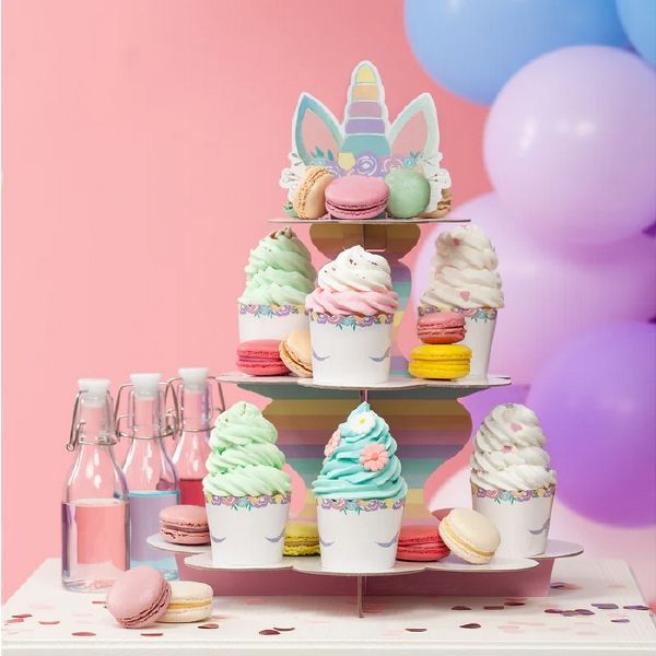 Der Muffin- und Cupcakeständer ist eine tolle Idee für eine praktische Tischdekoration, vor allem wenn er wie ein Einhorn aussieht. Die darauf platzierten Muffins ergeben eine Komposition, die man am liebsten mit den Augen essen möchte. Und der Anblick der leuchtenden Farben wird die Aufmerksamkeit der kleinen Partygäste auf sich ziehen und ihnen ein Lächeln ins Gesicht zaubern.