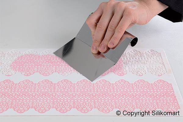 Hochwertiger Teigspachtel zum präzisen Verteilen von essbarer Spitze und Sahne auf der Torte.