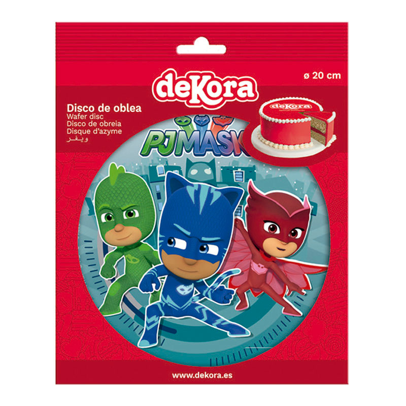 Essbares Papier für die schnelle und einfache Tortendekoration. Es handelt sich um ein glutenfreies Produkt. Für seine Herstellung werden hochwertige Rohstoffe und Farben in Lebensmittelqualität verwendet. Der Druck erfolgt mit einem speziellen Lebensmitteldrucker. Die essbare Torte ermöglicht das Dekorieren von Torten oder anderen Desserts. Sie wird auf die fertige Torte gelegt, deren Oberfläche mit einer dünnen Schicht Buttercreme oder essbarem Gel bestrichen werden kann. Legen Sie das Papier auf diese Schicht, streichen Sie es glatt und bestreichen Sie es erneut mit dem Gel. So haftet es besser und die Farben werden kräftiger. Legen Sie das Papier mindestens drei Stunden vor dem Verzehr auf die Torte, damit es beim Servieren weich ist. Dieses essbare Papier ist mit dem Motiv der Zeichentrickfigur PJ Mask bedruckt. Durchmesser 20 cm.