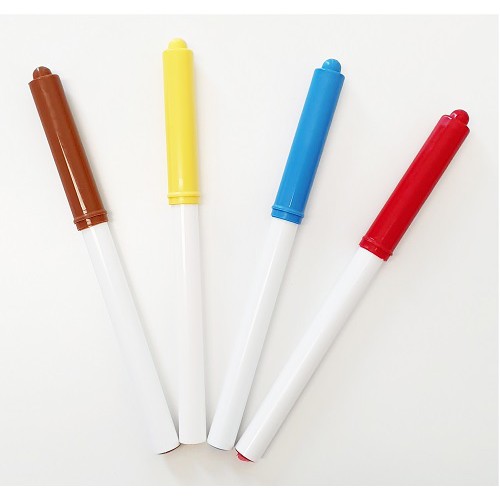 Vier Lebensmittelmarker, die mit essbarer Tinte gefüllt sind. Sie können verwendet werden, um kleine Details, Texte, Linien und mehr zu machen. Kann auf Fondant, Torten und Keksen verwendet werden. Geeignet zum Zeichnen von Augen, Mündern und anderen Details auf Modellfiguren und zum Erstellen von Adern auf Blättern und Blumen. Enthält die Farben Blau, Rot, Gelb und Braun.