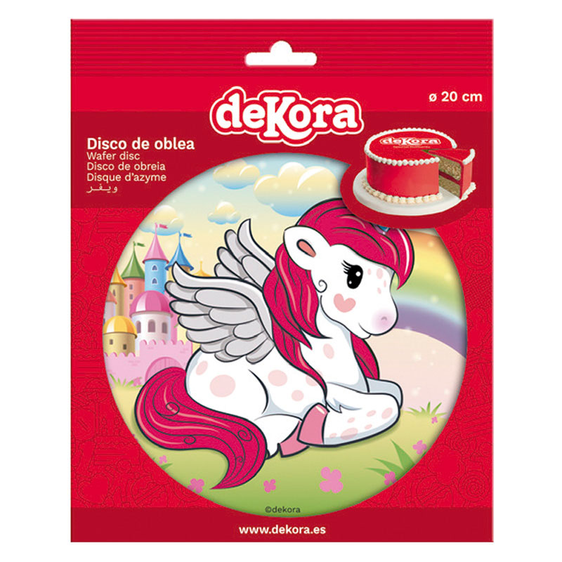 Esspapier für eine einfache und schnelle Dekoration von Kuchen. Es handelt sich um ein glutenfreies Produkt. Für seine Herstellung werden hochwertige Rohstoffe und Lebensmittelfarben verwendet. Der Druck erfolgt in einer speziellen Lebensmitteldruckerei. Das essbare Papier ermöglicht das Verzieren von Kuchen oder anderen Desserts. Es wird auf den fertigen Kuchen gelegt, dessen Oberteil Sie mit einer dünnen Schicht Buttercreme oder fixer essbarer Gel bedecken können. Legen Sie das Papier auf diese Schicht, glätten Sie es und bestreichen Sie es erneut mit Gel. Es hält besser und seine Farben werden heller. Legen Sie es auf den Kuchen mindestens drei Stunden vor dem Verzehr, damit es beim Servieren des Kuchens weich bleibt. Dieses essbare Papier ist mit dem Motiv eines zauberhaften Einhorns bedruckt. Durchmesser 20 cm.