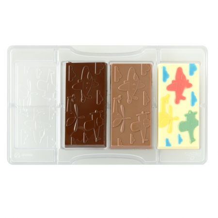 Komplette Reihe grafischer Schokoladenmodelle umfasst eine Schokoladenform für Pralinen mit Flugzeugmotiv. Professionelle Formen aus Polycarbonat, ein Material, dank dem die Schokoladen transparent und perfekt sind. Sie können vier Stücke Schokolade auf einmal herstellen.