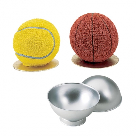 Hochwertige Aluminium-Backform für Kuchen in Kugelform. Der fertige Kuchen kann wie ein Tennisball oder Basketball aussehen, etc. Sie besteht aus zwei Halbkugeln und zwei Stützen. Der fertige Ball hat einen Durchmesser von 15 cm. Diese Backform ist nicht spülmaschinengeeignet.