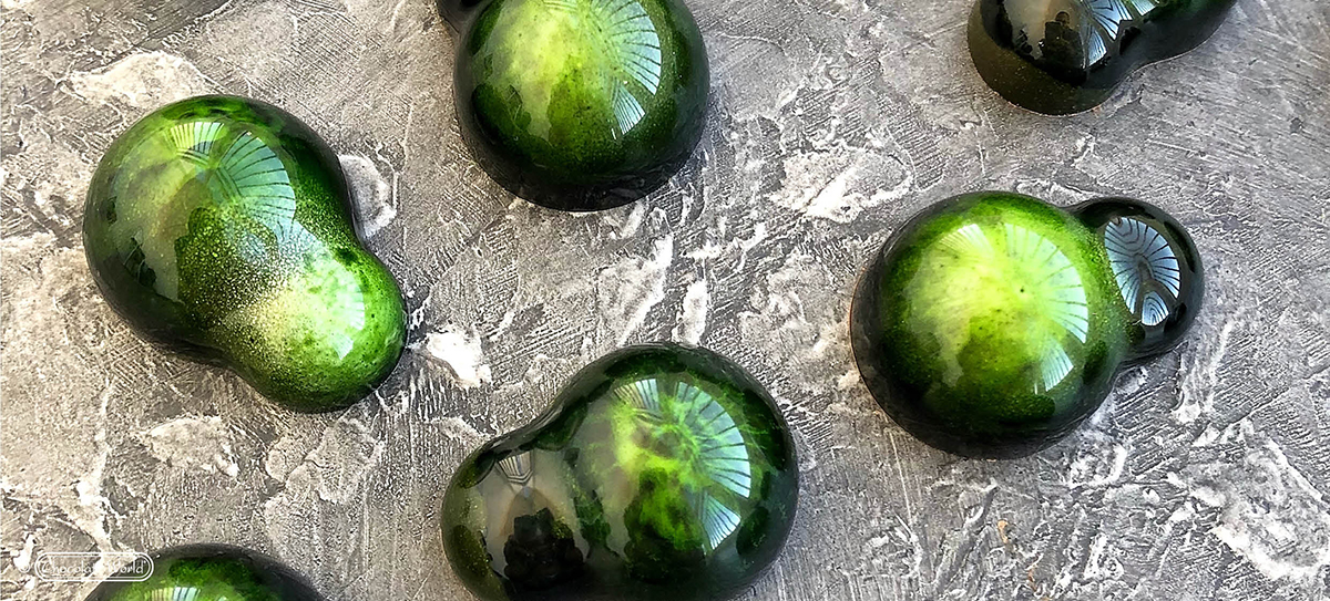Polycarbonatform für die Herstellung perfekter Schokoladentrüffel. Diese hochwertige europäische Form ist einfach zu verwenden, Ihre Schokolade hat eine glänzende Oberfläche und hebt sich leicht ab. Um bunte Schokoladenstücke zu erhalten, bestreichen Sie die Form mit einer dünnen Schicht gefärbter Kakaobutter, bevor Sie die Form mit Schokolade füllen. Das Design dieser Form stammt von Andrey Dubovik.