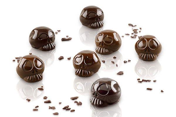 Schokoladenform in Form von Totenköpfen. Sie werden 12 Stück Schokoladenpralinen herstellen.