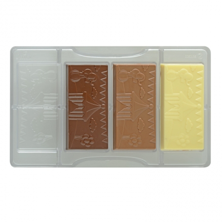 Komplette Reihe grafischer Schokoladenmodelle umfasst eine Schokoladenform für Pralinen mit Zirkusmotiv. Professionelle Formen aus Polycarbonat, ein Material, dank dem die Schokoladen durchsichtig und perfekt sind. Sie können vier Stücke Schokolade gleichzeitig herstellen.