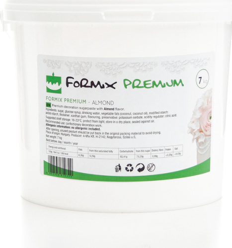 Eine weiße, besonders flexible Paste mit ausgezeichneten Eigenschaften, besonders geeignet für das Überziehen von Torten und das Modellieren von Figürchen. Sie ist beim Modellieren und Überziehen sehr elastisch, klebt nicht, behält schnell ihre Form und setzt sich auch bei der Herstellung größerer Objekte nicht "ab". Zutaten: Zucker, Glukosesirup, Trinkwasser, pflanzliche Fette (Kokosfett, gehärtetes Palmkernöl), modifizierte Kartoffelstärke, Verdickungsmittel: Xanthan, Aroma, Konservierungsstoff: Kaliumsorbat, Säureregulator: Zitronensäure Nährwertangaben pro 100 g: Energie 1641 kJ/388 kcal, Fett 6,26 g (davon gesättigt 5,29 g), Kohlenhydrate 82,41 g (davon Zucker 73,23 g), Ballaststoffe 0,99 g, Eiweiß <0,2 g, Salz <0,03 g