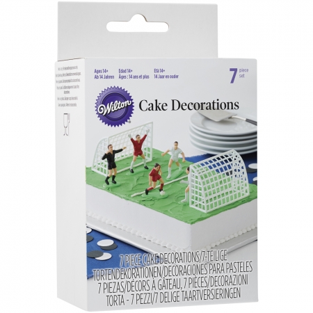 Das siebenteilige Figurenset enthält auch zwei Fußballtore. Diese ungenießbare Dekoration eignet sich zum Verzieren einer Torte in Form eines Fußballfeldes.