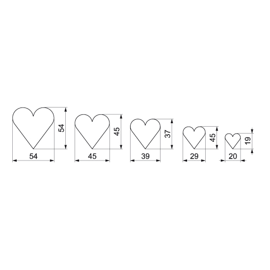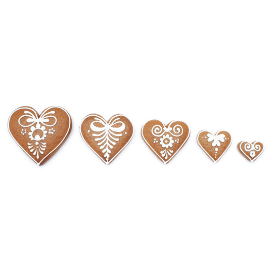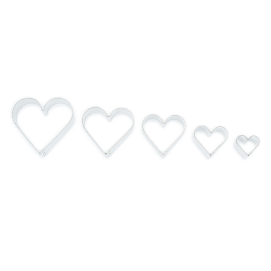 Herzförmige Ausstechformen mit fünf verschiedenen Größen (von 2 bis 5,4 cm) aus verzinntem, ungiftigem Blech. Die glatte Oberfläche der Ausstechformen ist leicht zu reinigen.