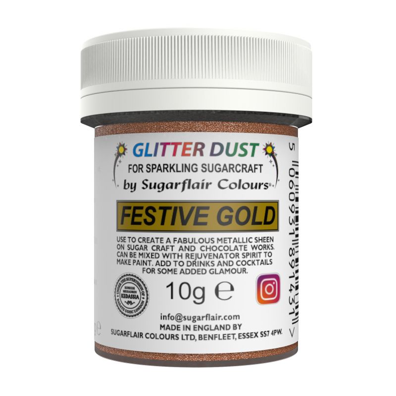 Sugarflair's Edible Luster in Festive Gold ist ein hochwertiges, vielseitiges und sicheres Produkt, das Ihren Kreationen einen schönen Glanz verleiht. Das perfekte Accessoire, um Ihren Kreationen den besonderen Touch zu verleihen. Dieser essbare Glanz kann direkt mit einem Pinsel aufgetragen werden und verleiht Ihren Backwaren einen schönen Glanz, der alle Blicke auf sich zieht. An einem trockenen Ort bei Raumtemperatur aufbewahren.