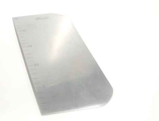 Teigspachtel aus rostfreiem Stahl mit spülmaschinenfester Skala. Geeignet für die Arbeit mit Sahne oder Ganache für eine glatte Oberfläche. Länge 25 cm. Abmessungen: 25x12 cm, Dicke 0,5 mm.