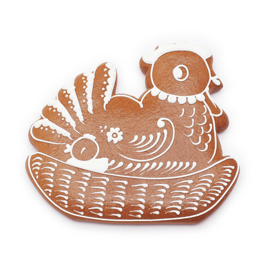 Ausstechform für Lebkuchen in Form eines Huhns auf einem Korb