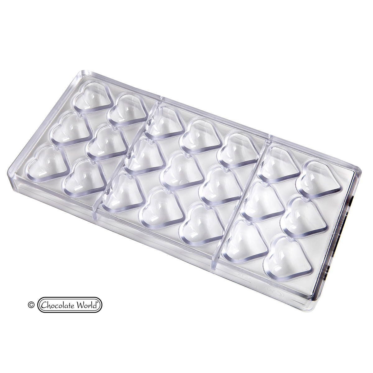 Die Polycarbonat-Formen von Chocolate World werden von professionellen Chocolatiers auf der ganzen Welt verwendet. Chocolate World ist der Weltmarktführer für Polycarbonat-Formen für professionelle Chocolatiers und bietet das größte Standardsortiment an Formen weltweit. Jede Form wird in Belgien mit hochglanzpolierten Werkzeugen nach ISO-zertifizierten Fertigungsstandards und unter menschlicher Qualitätskontrolle hergestellt. Mit der Polycarbonatform können Sie die perfekte Schokolade herstellen. Diese hochwertige europäische Form ist einfach zu verwenden, Ihre Schokolade hat eine glänzende Oberfläche und hebt sich leicht ab. Um farbenfrohe Schokoladenstücke zu erhalten, bestreichen Sie Ihre Form mit einer dünnen Schicht farbiger Kakaobutter, bevor Sie die Form mit Schokolade füllen. Das Design dieser Form ermöglicht es Ihnen, perfekte Formen mit sanft verlaufenden Linien zu formen.