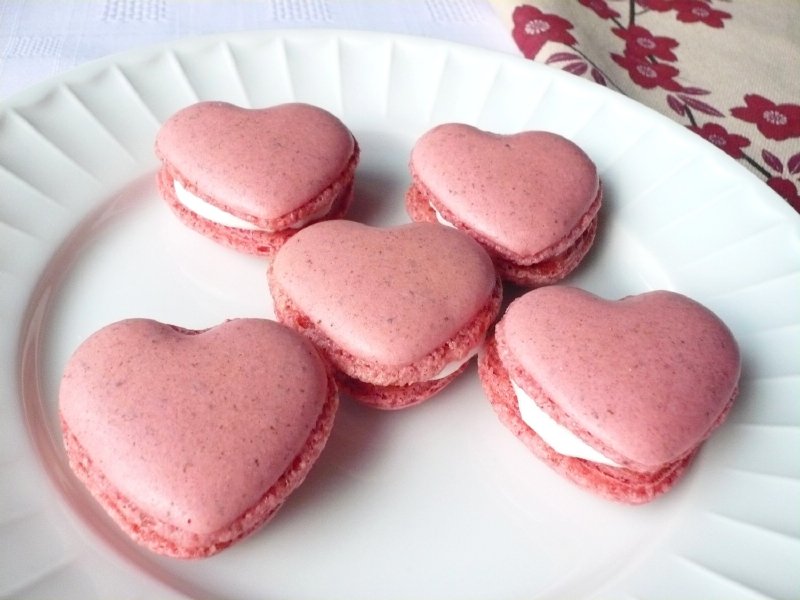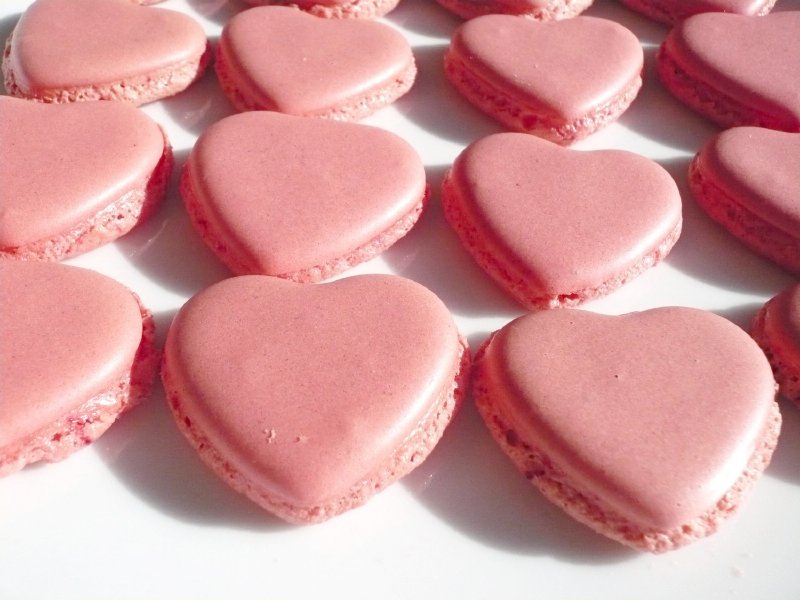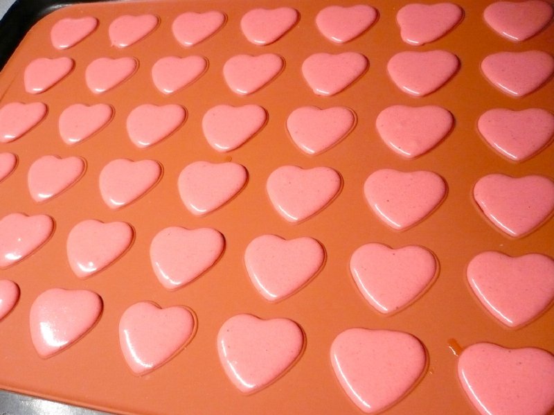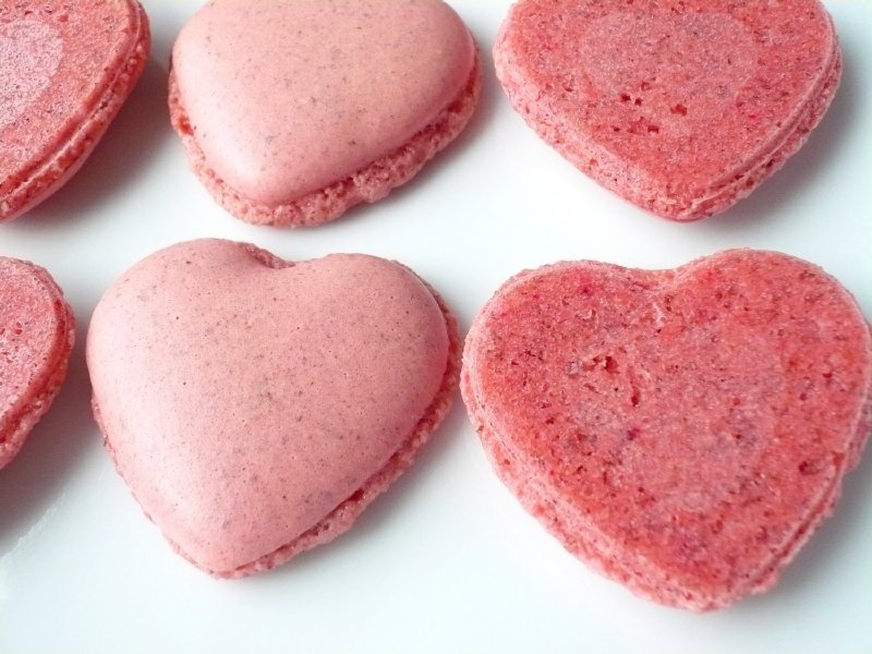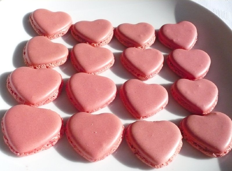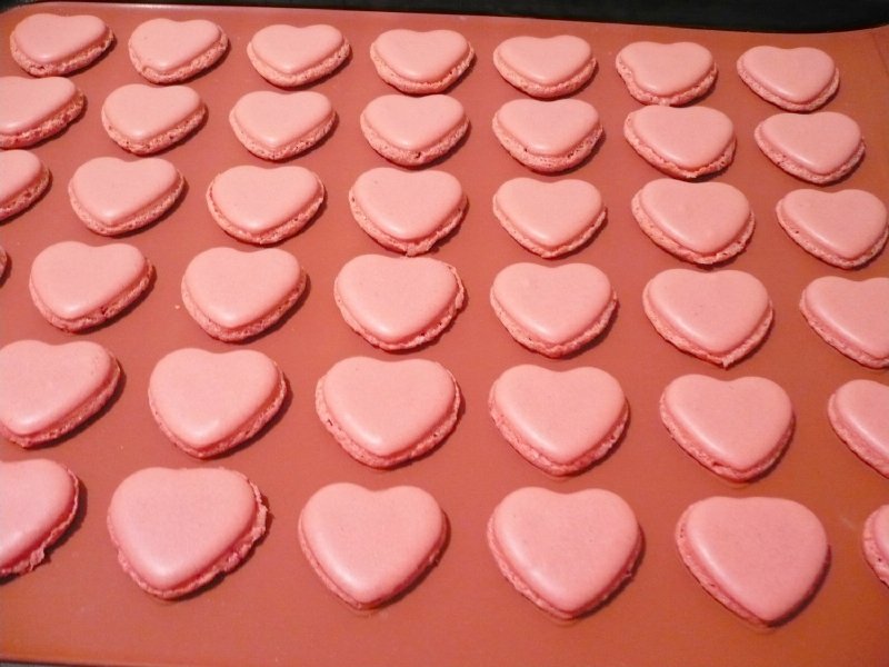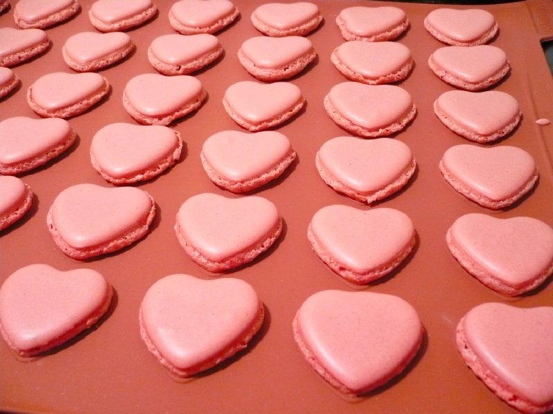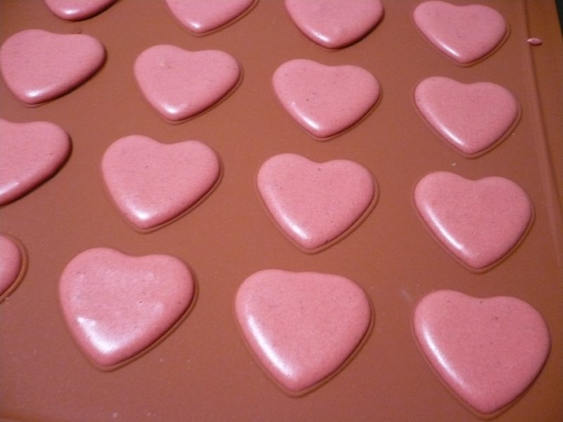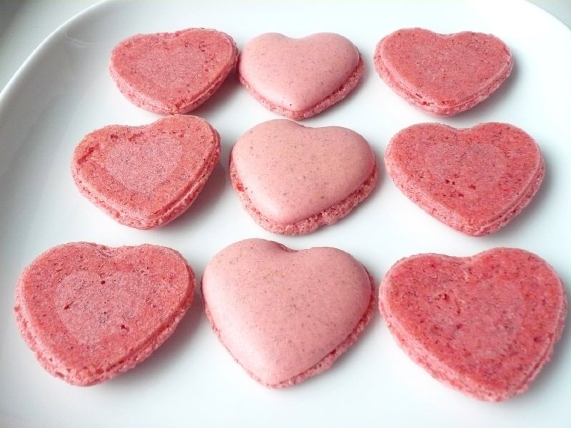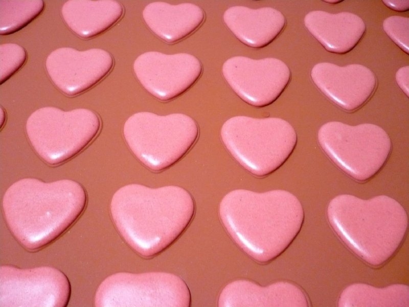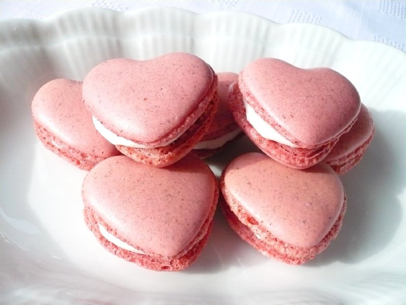 Makronen sind nicht zu fürchten, selbst wenn jemand beim ersten Mal scheitert, wird jeder sicher jeden Fehler in der Vorgehensweise erkennen und diesen beim nächsten Mal vermeiden. Das erste Mal kann man es mit einer halben Charge versuchen. Manche verwenden eine heiße Zuckerlösung, die mit dem Schneebesen unter die Eiweißmasse gerührt wird. Ich verwende die zweite Methode, aber Erfahrung und Zufriedenheit mit dem Ergebnis sind immer am besten. Bei der Herstellung von Makronen sind alle Schritte des Prozesses wichtig. So schlagen Sie einen steifen Schnee aus Eiweiß und Grießzucker mit Farbzusatz. Anschließend werden die fein gemahlenen Mandeln mit Puderzucker untergerührt. Es ist ratsam, die Mandel-Zucker-Mischung noch weiter zu verrühren, bis sie die Konsistenz von glattem Mehl hat, und zu sieben, um eine wirklich glatte Masse zu erhalten. Rühren und streichen, bis die Makronenmasse glänzend ist und langsam und träge vom Spatel fließt. Wenn die Masse zu dick ist, lässt sie sich nicht zu einem Herz formen und hat eine ungleichmäßige Oberfläche. Sie darf aber auch nicht zu dickflüssig sein, sonst wird sie wieder zu flüssig. Die gut vermischte Masse in einen Spritzbeutel mit glattem Ende füllen und die Löcher in der Form V-förmig ausfüllen. Die Form auf ein Backblech stellen. Nachdem Sie die gesamte Form mit dem Blech gefüllt haben, klopfen Sie ein paar Mal auf den Tisch oder heben Sie das Blech in eine Hand und klopfen Sie mit der Handfläche dagegen. Der Teig sollte langsam und gleichmäßig in die herzförmigen Löcher fließen und eventuelle Luftblasen werden herausgedrückt. Lassen Sie die Makronen dann auf der Oberfläche gut trocknen, sie dürfen nicht an der sanften Berührung mit dem Finger kleben. Dies kann je nach Raumtemperatur eine Stunde oder länger dauern. Dann das Backblech in den auf etwa 150 °C vorgeheizten Ofen schieben und die Makronen etwa 13 Minuten lang backen. Die Temperatur und die Backzeit sind nur ein Richtwert. Jeder Ofen backt etwas anders, und wenn man die Makronen auf der Backmatte backt, dauert das Backen etwa 1 bis 2 Minuten länger als direkt auf dem Backblech. Wenn Sie unsicher sind, versuchen Sie, einen Macaron von oben nach unten zu schieben. Wenn er fest ist und sich nicht verbiegt, sollte er gebacken sein. Entfernen Sie das Backblech und nehmen Sie die Makronen heraus, sobald sie vollständig abgekühlt sind. Dann mit der Creme füllen und vor dem Servieren ca. 10 Stunden fest werden lassen.