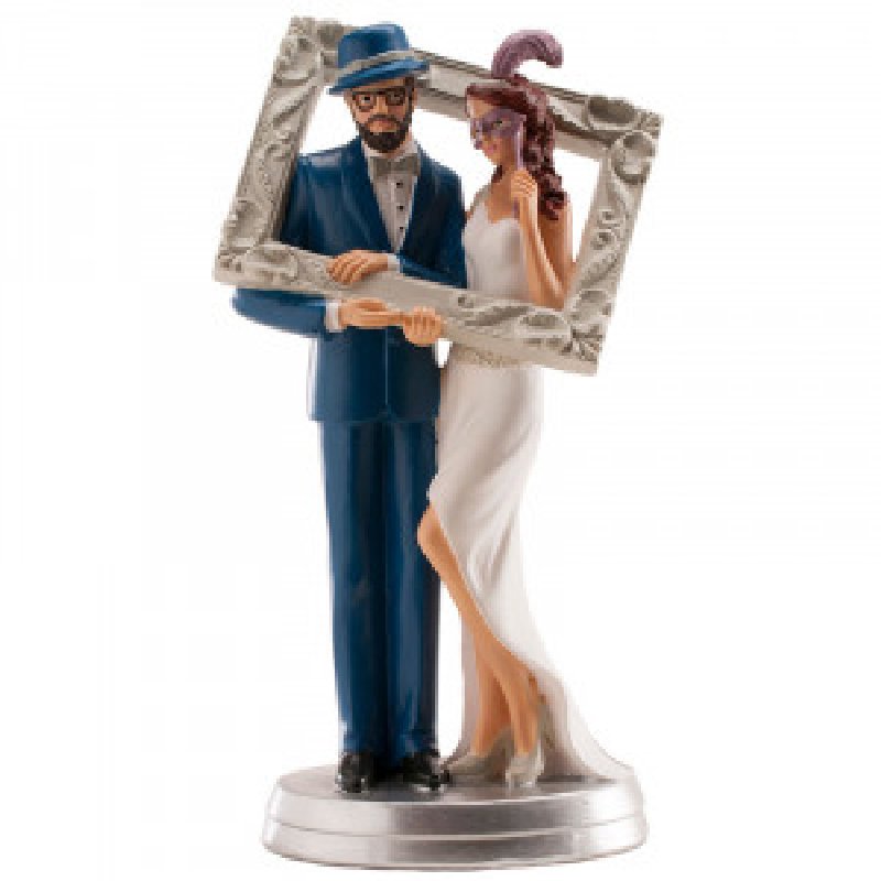 Elegantes Feiertagsornament ist perfekt für die Dekoration von Hochzeitstorten. Die Hochzeitsfigur ist eine einfache und elegante Lösung für die Dekoration von Torten. Die Hauptfiguren dieser dekorativen Figur aus Harz sind das Paar "eingerahmt" in einem eleganten Rahmen, posieren, um eine wirklich künstlerische Fotografie zu schaffen. Ideal für leicht exzentrische Paare und Künstler. Diese ungenießbare Dekoration ist wiederverwendbar, Sie können sie als Erinnerung an Ihren Hochzeitstag aufbewahren. Höhe 18 cm.