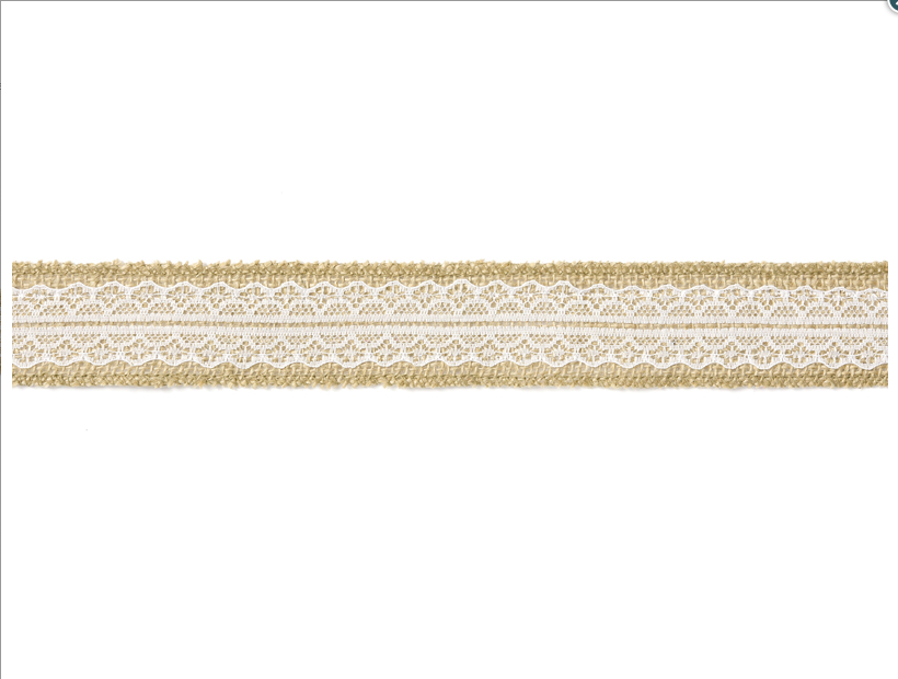 Juteband mit einfacher Spitze. Abmessungen 4 x 500 cm.