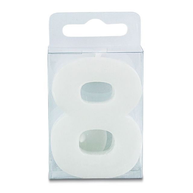Kerze in Form der Zahl 8, Höhe 4 cm, weiß. Es ist besonders geeignet für Geburtstagskuchen und Dekoration ähnliche Desserts. Die Kerze entspricht in vollem Umfang mit allen Sicherheitsvorschriften.