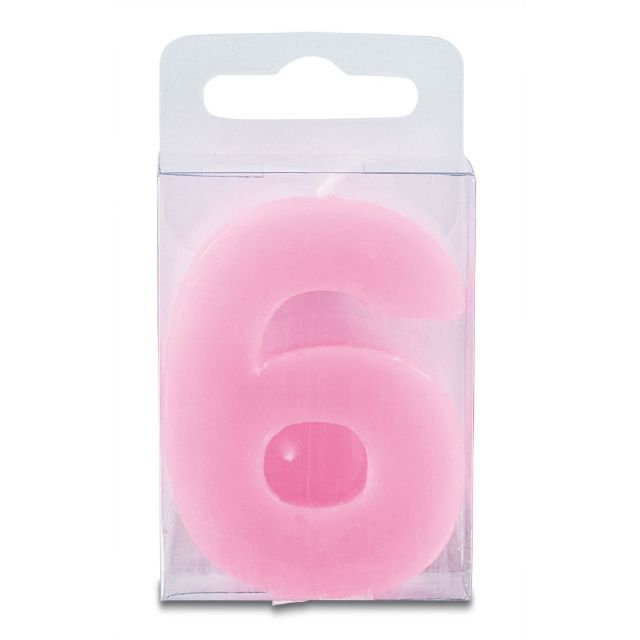 Kerze in Form der Zahl 6, rosa Farbe, Höhe 4 cm. Sie eignet sich besonders für die Dekoration von Geburtstagskuchen und ähnlichen Desserts. Die Kerze erfüllt alle Sicherheitsvorschriften.