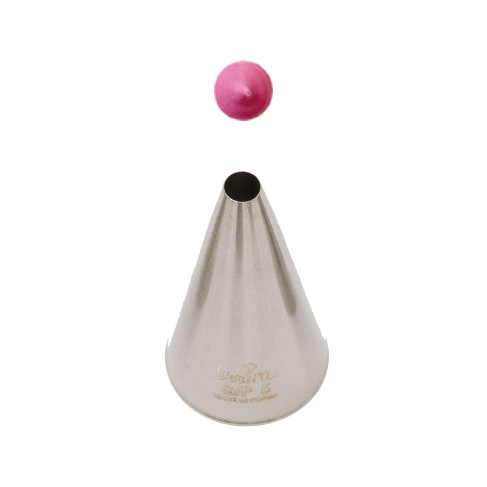 Metallische Konditor-Dekorationsspitze rund S/P5 garantiert Ihnen eine präzise und einzigartige Verzierung. Die Spitze können Sie wiederholt mit dem Dekorationsbeutel verwenden. Sie besteht aus Edelstahl; Fettflecken haften nicht auf der Oberfläche. Nicht geeignet für die Spülmaschine.